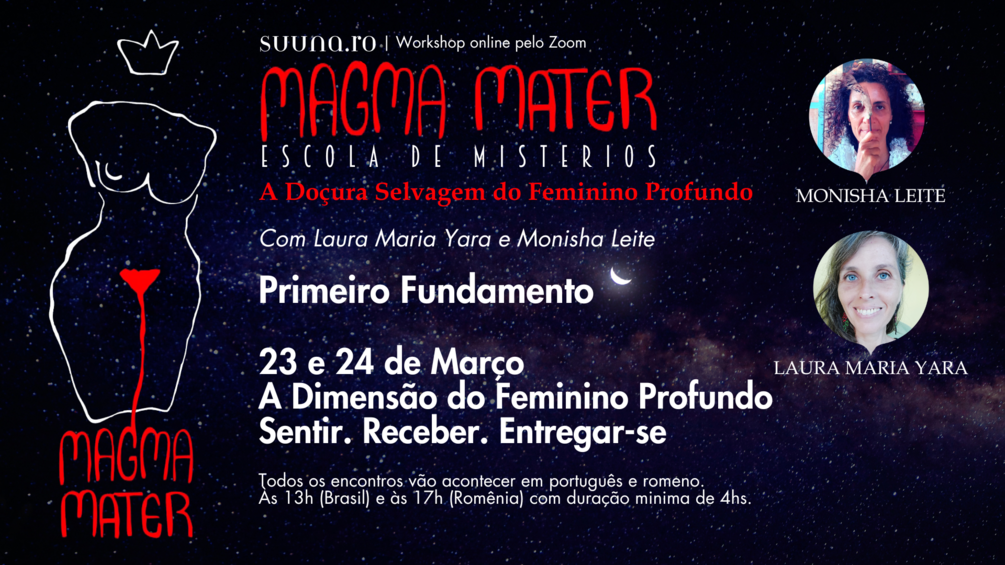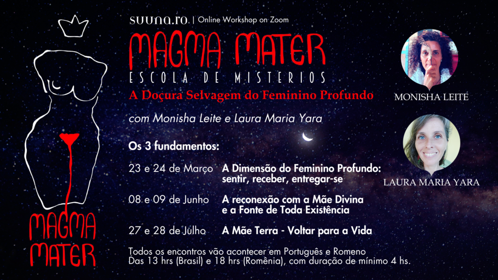 Somos Laura Maria Yara e Monisha Leite, e Magma Mater é a nossa jornada de volta à Dimensão do Feminino Profundo. Aquela de onde nascem a Essência, a Doçura, a Devoção. A Mágica, o Poder, o Amor. Aquela de onde a Mulher Néctar retorna ao seu corpo em profunda reverência e comunhão com a Dimensão do Masculino Sagrado – aquela parte em nós que nos protege, que vai na frente abrindo os caminhos e é a força motriz de direcionamento e expressão da Alma, do Coração.